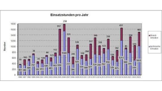 | Jahr | Anzahl Technische Einsätze | Stunden Technische Einsätze | Anzahl Brandeinsätze | Stunden Brandeinsätze | Gesamteinsätze | Gesamtstunden |