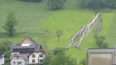 Bei einer Überflutung der B121 direkt im Markt mussten auf der steilen überfluteten Wiese mehrere Gräben gezogen werden, um die Wassermassen in die Abflussschächte zu leiten.