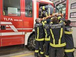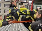Personenrettung aus einem LKW: Aufgrund der großen Höhen stellt die Rettung der Person aus der Fahrerkabine eine besondere Herausforderung dar. Mittels der Rettungsboa und Spineboard wurden verschiedene Varianten probiert. Auch die neu angeschaffte Rettungsplattform konnte dabei erfolgreich eingesetzt werden.