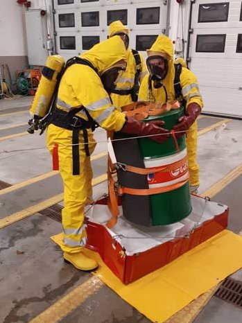 Dazu rüstete sich ein Atemschutztrupp mit Schutzanzügen der Schutzstufe2 aus und erkundete den Bereich. Wobei ein Fass aufgefunden wurde bei dem aus einem Loch der Stoff austrat. Mittels Dichtplatte und Gurten wurde der Austritt gestoppt und danach das Fass in einen sicheren Bereich verbracht. Danach wurde der Trupp entsprechend dekontaminiert und die Ausrüstung versorgt.