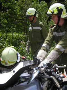Beim Motorrad, das über eine steile Böschung gestürzt war und knapp neben einem Bach zum Liegen kam, wurde ein Brandschutz aufgebaut. Aus dem Bach wurden heruntergerissene Teile des Motorrads geborgen und kontrolliert, ob keine Betriebsstoffe ausgetreten waren. Weiters wurden die Rettungskräfte unterstützt. Nachdem der Unglückslenker transportfähig gemacht worden war, wurde dieser mittels Notarzthubschrauber abtransportiert. Danach konnte das Motorrad geborgen werden. Nach Abklemmen der Batterie wurde diese sicher abgestellt. Danach rückten die Einsatzkräfte wieder ins Feuerwehrhaus ein.