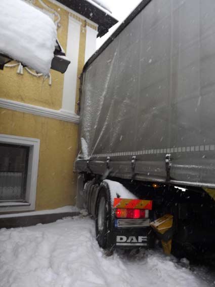GAFLENZ: Auch in Gaflenz sorgte der Schneefall für eine LKW Bergung. Ein ausländischer LKW krachte bei der Einfahrt in die "Gaflenzer Enge" gegen ein Haus und verkeilte sich derart, dass eine Weiterfahrt unmöglich war. Die beiden Lenker überstanden den Unfall unbeschadet. Es kam aber zu einer kompletten Blockade der B121, was zu erheblichen Problemen und leider auch zu einem Folgeunfall mit Blechschaden führte.