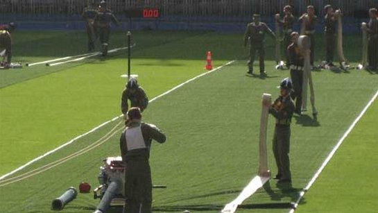 Die letzte Übergabe - es kommt zu Problemen beim Angreifen des Strahlrohrs und.........es fällt zu Boden. Der 6-er muss abbremsen und umdrehen.