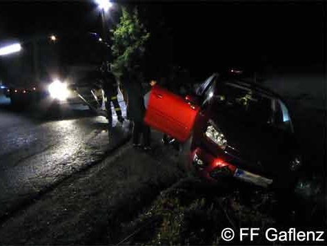 GAFLENZ: Beim Zurückschieben kam eine Lenkerin mit ihrem PKW zu weit an den Straßenrand und rutschte seitlich ab. In starker Schräglage blieb der PKW zum Glück an der Geländekante hängen.
