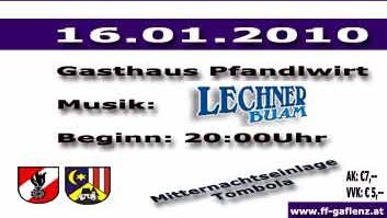 GAFLENZ: Am Samstag, den 16. Jänner 2010 fand beim Pfandlwirt der traditionelle Feuerwehrball der FF Gaflenz statt. Kommandant HBI Weissensteiner Christian konnte Herrn Bürgermeister Günther Kellnreithner und neben den zahlreich erschienen Gästen auch viele Feuerwehrkameraden der Nachbarsfeuerwehren begrüßen.