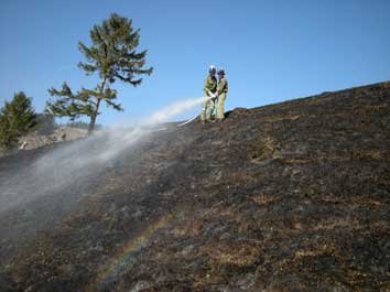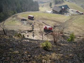 Kurz vor halb 12 Uhr heulten in Gemeindegebiet von Gaflenz sowie bei der Feuerwehr Moosgraben die Sirenen. "Brand: Baum, Flur, Böschung" war am WAS abzulesen. Sofort rückte das TLF Gaflenz zum Einsatzort, gefolgt vom LFB-A2 und KDO aus. Es handelte es sich dabei um eine steile Böschung oberhalb eines Bauernhauses in einem höher gelegen Ortsteil von Gaflenz. Etwa 1ha Wiese war vom Brand im schwer zugänglichen Bereich betroffen. Kurz vor dem TLF trafen die Einsatzkräfte der FF Moosgraben am Einsatzort ein und bauten unverzüglich eine Wasserentnahmestelle bei einem 6.000lt. Behälter direkt unterhalb des Brandplatzes auf. Für das TLF Gaflenz wurde unter dessen mittels Traktor der Wirtschaftsweg soweit befahrbar gemacht, dass das TLF relativ nahe zum betroffenen Bereich vorrücken konnte. Die Mannschaft begann mit einem ersten Löschangriff mittels C-Rohr. Die FF Moosgraben baute eine Angriffsleitung von der anderen Seite her auf und setzte ebenfalls C-Rohre ein. Inzwischen errichtete die Mannschaft vom LFB-A Gaflenz eine Wasserentnahmestelle am Bach (Entfernung: etwa 1 km). Die Kräfte der FF Lindau Neudorf unterstützten die Brandbekämpfung mittels Feuerpatschen. Für die weitere Brandbekämpfung wurde das TLF Gaflenz an der Wasserentnahmestelle beim Bach mehrmals gefüllt. Nachdem der Brand gelöscht war, wurde die gesamte Fläche nochmals mit Wasser benetzt und danach mit den Aufräumarbeiten begonnen.