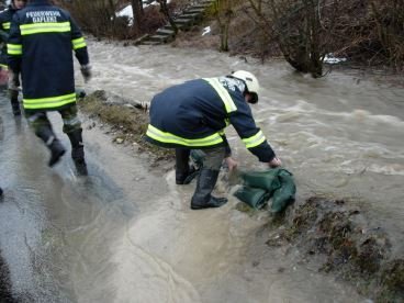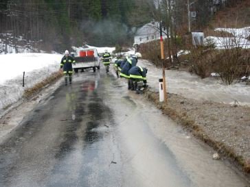Die Wassermassen überfluteten die Straße und drohten auch bei den anliegenden Häusern in die Keller zu rinnen. Mit Sandsäcken wurde das weitere Übertreten verhindert, bei den Hauseinfahrten wurden zur Sicherheit Wälle mit Sandsäcken gelegt.