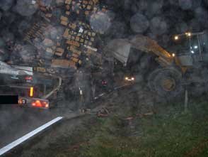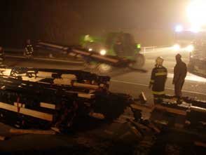 Das Richten der Ladung mittels Stapler wurde ebenfalls versucht, doch auch dies gelang nicht, Das Angebot, ein Kranfahrzeug anzufordern, wurde nicht angenommen, und daher mussten die verrutschten Holzpfosten abgeladen werden. Nachdem die Zurrgurten gelöst worden waren, fiel ein Großteil der Ladung auf die Straße. Danach wurden die Holzpfosten auf einen Holzlagerplatz geführt. Zuvor mussten die Einsatzkräfte wieder Stöße schlichten, damit ein Verladen möglich war.