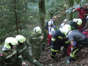 Seitens der Feuerwehrkräfte wurden die Rettungskräfte beim Umlagern der Person unterstützt. Aufgrund der Lage, ein stark bewaldetes, extrem steiles Gelände, entschied der Notarzt, dass die Rettung mittels Tau erfolgen soll und dazu mehrere Bäume zu fällen sind. Ein Transport der Person mittels Korbschleiftrage auf eine Lichtung wurde als zu riskant eingestuft. Daraufhin wurde die Person im Bergesack des NAH in sichere Entfernung gebracht. Anschließend wurden von den Einsatzkräften mehrere Bäume gefällt, wodurch sich eine Öffnung im Wald auftat, die von der NAH-Crew genutzt wurde, um die Person samt Flugretter und Notarzt zu retten. In einer atemberaubenden Demonstration der Flugkünste des Piloten konnte die Rettung erfolgreich mittels Taubergung durchgeführt werden. Auf einer Wiese im Tal wurde die Person danach in den Hubschrauber gelagert und ins Spital geflogen.