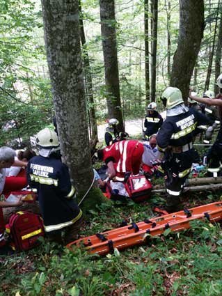 GAFLENZ: "Personrettung ....", so die Einsatzmeldung für die beiden Feuerwehren des Pflichtbereichs Gaflenz. Das ersteintreffende LFB-A2 der FF Gaflenz fand folgende Lage vor. Eine Person war bei Waldarbeiten im steilen Gelände am Bein von einem Baum eingeklemmt worden, konnte sich aber selbst befreien und die Rettungskette in Gang setzen.