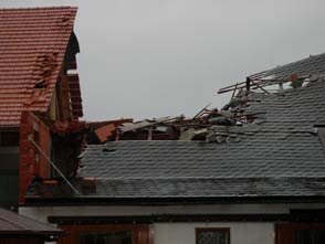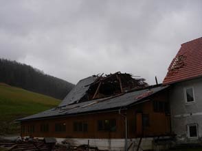 Die nächste Einsatzadresse führte zu einem massiven Sturmschaden. Teile des Dachstuhls wurden komplett weggerissen, ebenso weitere Teile des Dachs. Mittels Deckensteher wurde die Dachkonstruktion gesichert und mittels Planen ein weiterer Wassereintritt verhindert.
