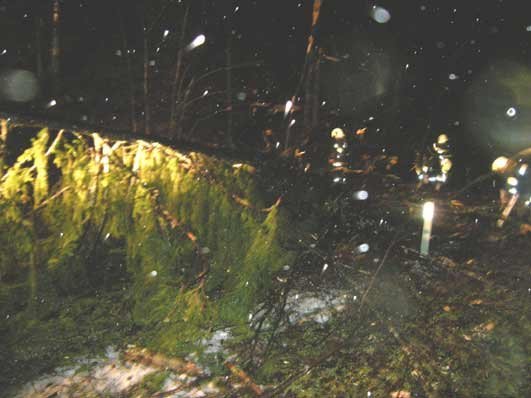Nachdem die Einsatzstelle abgesichert und ausgeleuchtet war, begannen die Kräfte die Bäume mittels Motorsäge zu zerkleinern und so die Straße frei zu machen. Ebenfalls wurde ein Feuerwehrkamerad mit seinem Traktor und Forstanhänger nachgefordert um die Bäume aus dem Bach zu heben und so einer möglichen Verklausung vorzubeugen.