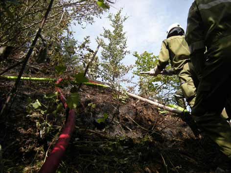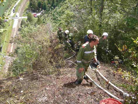 Aufgrund der Schadenslage wurde vom Einsatzleiter nach dem Eintreffen sofort die Alarmstufe 2 für das Einsatzstichwort "Brand groß" ausgelöst. Somit heulten bei insgesamt 9 weiteren Feuerwehren die Sirenen, darunter auch im Gemeindegebiet von Gaflenz. Beim Eintreffen der Mannschaften der FF Gaflenz waren bereits erste Einsatzkräfte in extrem steilem, unwegsamen, felsigem Gelände mit dem Aufbau einer Angriffsleitung von der Bahnstrecke nach oben beschäftigt. Eine weitere Leitung wurde direkt im Steilgelände von einer Forststraße ausgehend aufgebaut. Um überhaupt zum Brandort vordringen zu können, war zuerst der Aufbau einer umfangreichen Seilsicherung notwendig. Nur so war es überhaupt einigermaßen möglich, das Gelände sicher betreten zu können und den Aufbau einer Löschleitung durchzuführen. Neben diesen Extrembedingungen setzte auch das Wetter mit Temperaturen von mehr als 30°C den Einsatzkräften stark zu. Mit mehreren C-Rohren wurde die Brandbekämpfung begonnen, wobei auch hier ein Großteil der Kräfte mittels Höhensicherungsset gegen einen Absturz gesichert werden musste.